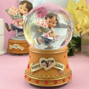 台湾WSA精品《PUPPY LOVE纯洁的爱》水晶球音乐盒,高档树脂加玻璃材质,色彩鲜艳,设计创意,卡通人物造型,表情生动,超级可爱,做工精细...宝贝底部转盘即音乐发条,扭动发条,音乐响起,宝贝整体还会旋转。超赞超可爱的一款宝贝,送给同样可爱的TA,定会让其爱不释手!