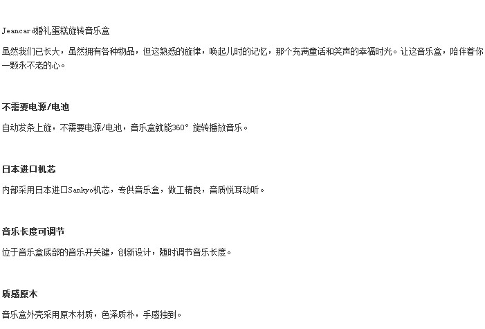 本款木质音乐盒八音盒为宝岛台湾Jeancard公司出品,保证正品。由于木质纹路和拍摄灯光效果不同,与图片有点色差属于正常现象。请悉知!